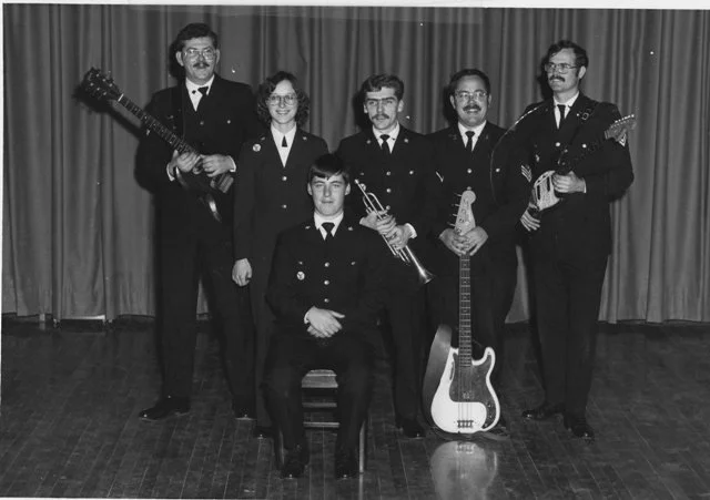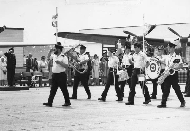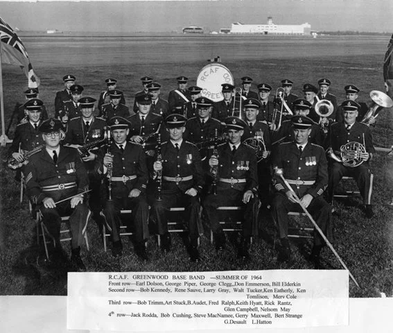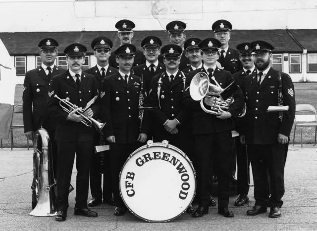 At one time, the importance of military music saw drummers and buglers leading the force into the face of the enemy. Now in a more ceremonial role, military bands have just as valued a role. The 75-year history of the 14 Wing Greenwood band is now captured in a display at the Greenwood Military Aviation Museum. Opened October 17, the exhibit includes photos, instruments, drum head art, uniforms and a fully-kitted out piper – complete with bagpipes. “The museum is always changing, and telling a story,” said Ian Patrick, chairman of the volunteer museum society’s board of directors and head of exhibits. While the focus started with the military squadrons and missions, the museum features displays about the base’s supporting elements, and life in Greenwood. “This band display is really a credit to this man here,” Patrick said, pointing to Erle Dolsen, standing beside him. “He showed up one day about 15 years ago with a bandmaster’s uniform: ‘Would we like this?’” Dolsen was bandmaster at 14 Wing from 1962 to 1972, cobbling together a band from servicemen begged from their bosses for practices. “’We are your publicity,’ I told them,” Dolsen said, “and it caught fi re.” Dolsen advocated for instruments, uniforms and time; but the band made its mark on the base and in the wider community.