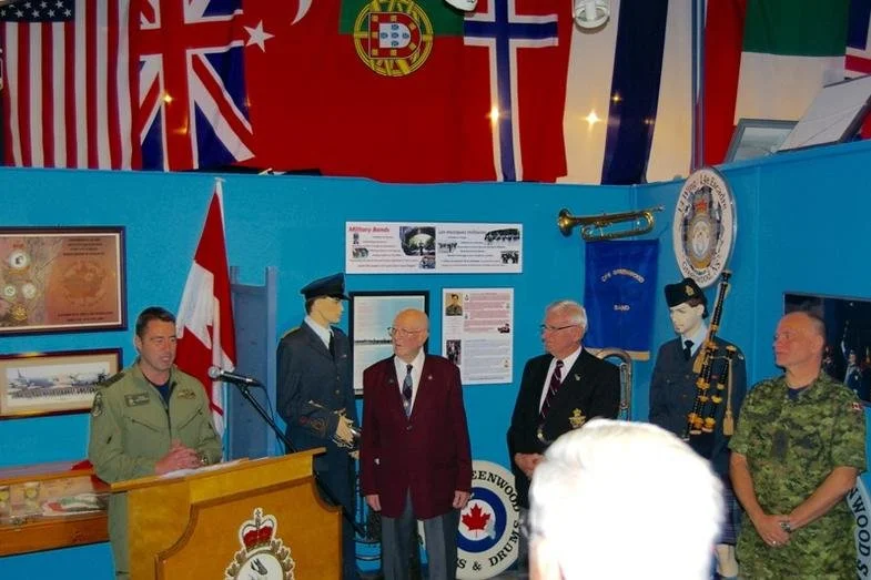 While he himself played for the Queen, United States President Harry Truman and was The Last Post bugler in Ottawa for many years; Dolsen remembers one invitation the band accepted to play for the Nova Scotia lieutenant governor’s lawn party. “Everyone was happy, we played, the food was served. Afterwards, the lieutenant governor came forward and called the waiter, asking him for a case of cold beer for us. The waiter said he didn’t have any. The lieutenant-governor said his hearing was poor. Well, about five minutes later, that case of cold beer arrived with glasses, and we passed it out and there was one left. I asked the lieutenant-governor would he like to share it with me. We sat down on the black box I stood on to conduct, all scuffed up from my shoes, and he talked to us, the men. “What a wonderful experience. The most important man in Nova Scotia - sitting there with a beer as if he was one of us. We enjoyed those things. It was about playing for and meeting people, and getting the music across from the band.” Dolsen commended current bandmaster Warrant Officer Jeff Campbell and Pipe Major Sergeant Andrew Bruce for continuing to do that today. “The magic of music is still there.” Campbell thanked the museum for taking an interest in the wing’s band heritage, and went on to thank the band itself: beyond the bandmaster and the pipe major, two military members; membership in the Pipes & Drums and the Brass & Reeds bands is entirely volunteer.