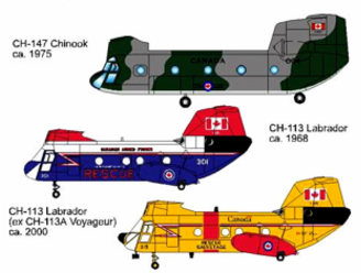 The Labrador aircraft is a twin-engine, tandem-rotor search and rescue (SAR) helicopter used by the Canadian Forces from 1963 until 2004. A variant of the Boeing -Vertol CH-46 Sea Knight, it was designed and built in the United States. Six search and rescue versions, manufactured in 1963 by the Boeing-Vertol division in Morton, Pennsylvania, were purchased by the Royal Canadian Air Force (RCAF) and known as the CH-113 Labrador (Lab). The Canadian Army acquired 12 of the similar CH-113A Voyageurs for the medium-lift transport role, but when the larger CH-147 Chinooks were procured in the mid-1970s, the Voyageur fleet was transferred to the SAR role providing 15 SAR aircraft across Canada divided into 4 units: 442 Sqn Comox, BC; 424 Sqn Trenton, ON; 413 Sqn Summerside, PEI (Greenwood, NS when 413 was moved) and 103 RU/Sqn Gander, NF.